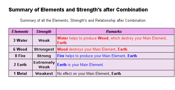 11. Determining a person's element strength is extremely important as a weak earth is different from a strong earth. In our reports, we go all out to provide all the necessary analysis to determine this as we understand the importance and impact of having determined the correct element strength.